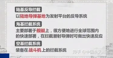导弹拦截系统按其发射的载体不同,可分为陆基、海基、空基。陆基反导拦截也就是以陆地导弹基地为发射平台的反导系统;海基拦截系统主要部署于舰艇上,很方便地进行全球范围内的快速部署,在拦截潜射导弹时可做出快速反应;此外,空基拦截系统是装备在战斗机上的拦截系统。