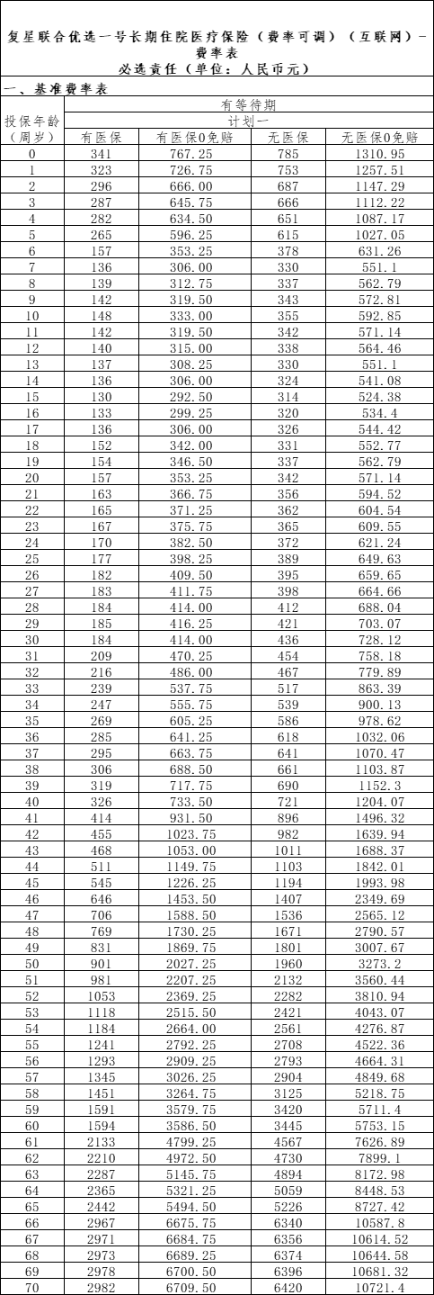 有医保版本的话,30岁的缴费额是每年184元,从40岁开始就一路激增,最高到70岁每年的缴费额则变为2982元,而不计免赔版本的则变为6709元。