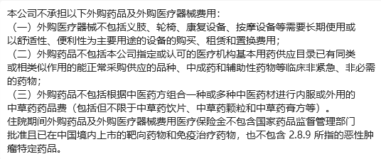对于院外购买,主要有三个不报销,第一个是医疗器械如轮椅、按摩设备等,第二个是中成药等,第三个是中草药等以及恶性肿瘤特定的靶向药物和免疫治疗药物。