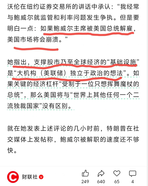她指出,支撑股市乃至全球经济的“基础设施”是“大机构(美联储)独立于政治的想法”。如果关键的经济杠杆“受制于一位只想挥舞魔杖的总统”,那么美国将与“世界上其他任何一个二流独裁国家”没有区别。