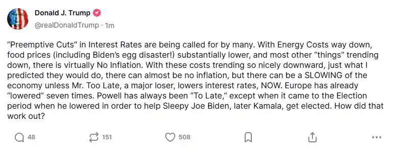 4月21日,美国总统特朗普在社交平台“真实社交”上再次发文称,“几乎不可能出现通货膨胀”。特朗普称,经济可能会放缓,除非“太迟先生”美联储主席鲍威尔现在就降低利率。特朗普还表示,欧洲已经“降息”七次了,除帮助前总统拜登当选而降息外,鲍威尔总是“来得太晚”。