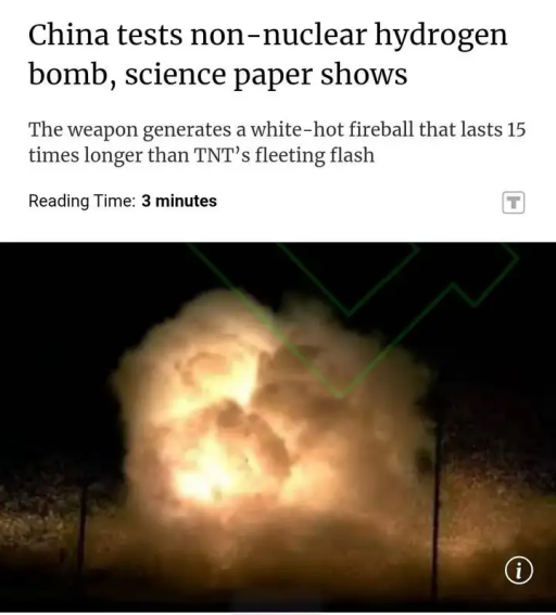 科学论文显示,中国测试non-nuclear hydrogen bomb(非核氢弹)。副标题是:这种武器产生一个白热火球,持续时间比TNT长15倍。