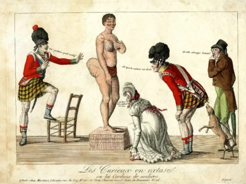 南非女土著萨拉(莎拉•巴尔特曼),两个孩子夭折,父亲和丈夫被殖民者杀害,于1810年被殖民者抓到了英国伦敦,充当稀有物品进行展出,因为她有一个极其罕见的巨大臀部。