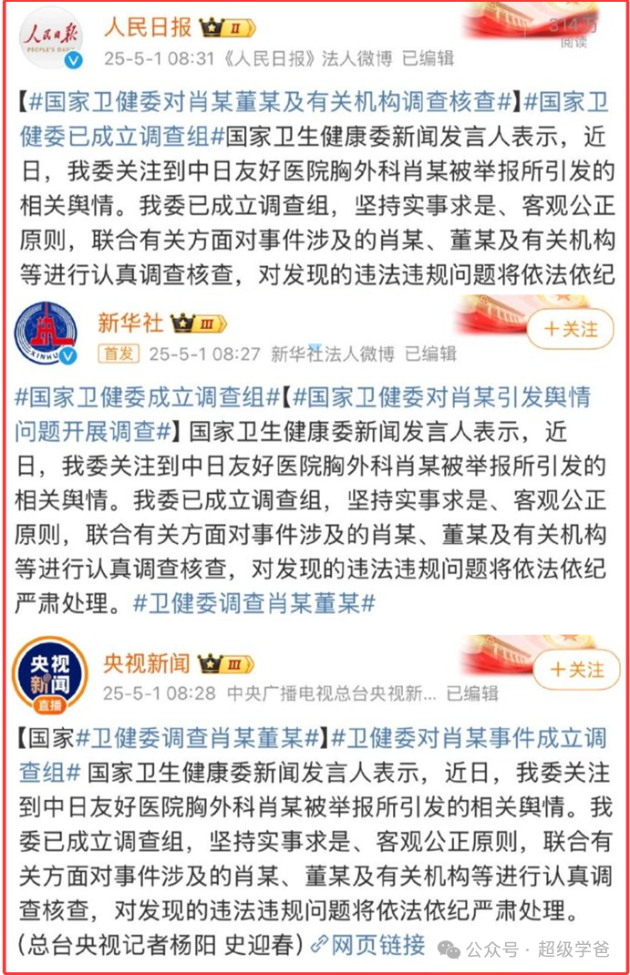 5月1日,国家卫健委宣布成立调查组,对涉事医生肖飞、董袭莹及相关机构展开全面核查,强调将依法依纪严肃处理违法违规问题。