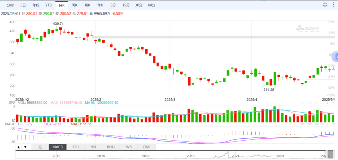 特斯拉股价从二进宫的特朗普政府正式走马上任(1月20日)时的高点439.74(20日之前的一个交易日,1月17日),下跌到5月1日收盘时的280.51,下跌了36.2%。股票涨涨跌跌本来也很正常,但问题只是因马斯克的DOGE工作得罪了太多人,殃及了他的企业,被他得罪的群体因此对特斯拉汽车群起进行抵制,致使特斯拉销量急剧下滑,业绩急剧滑坡。所以,这种业绩下滑并非正常经营本身的问题,而纯属马斯克通过DOGE参与美国政治带来的负面外溢效应。
