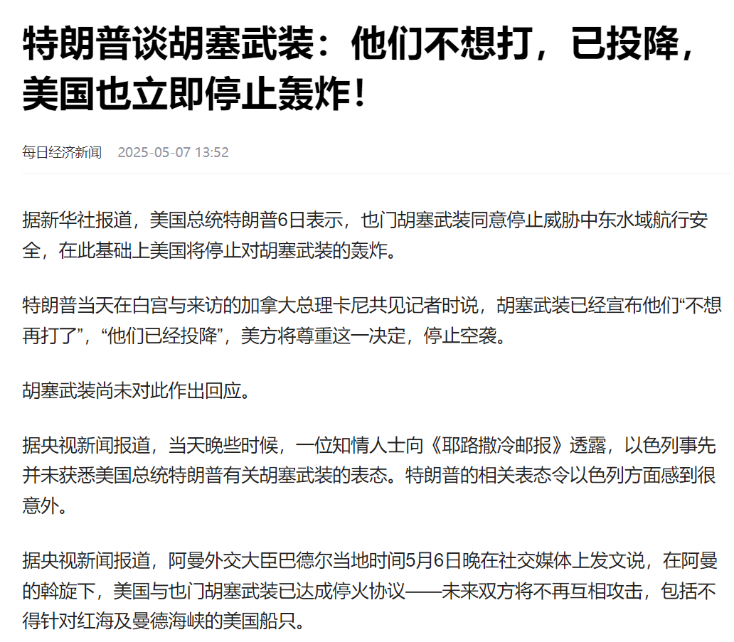 胡塞武装已经宣布他们“不想再打了”,“他们已经投降”,美方将尊重这一决定,停止空袭。