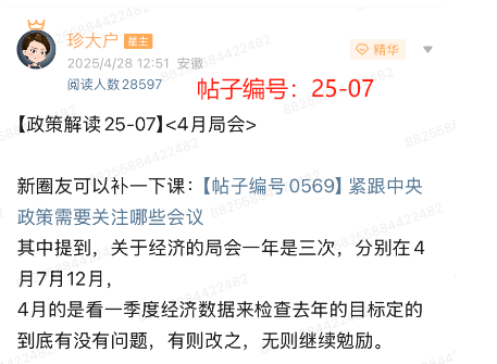 25号的局会透露出关于股市、房产、房价、民生、就业等等很多信息,不太好公开讲。我在圈子里写了5500字的分析了。