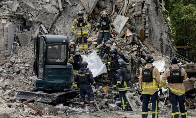 乌克兰东部城市克拉马托尔斯克一栋建筑遭袭,救援人员从废墟中移出一名遇难者遗体。