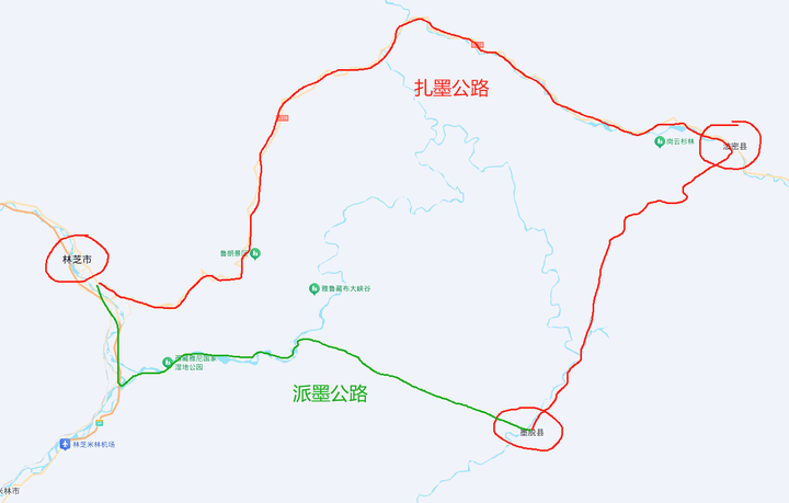 目前这一地区具备铁路和航空运输条件的地方只有林芝市,有连通青藏铁路的林拉铁路,有米林机场,通往派镇至少有两条2车道铺装道路,派镇到达多雄拉山口道路也要远比扎墨公路那边平缓很多,雪崩、塌方路段更少。