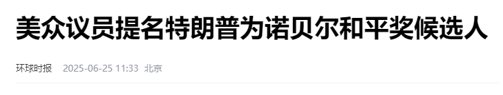 第二个事情就是阻止了中东战争,让伊朗和以色列停火,美国共和党议员非常有眼色,立马提名特朗普为2026年诺贝尔和平奖得主。