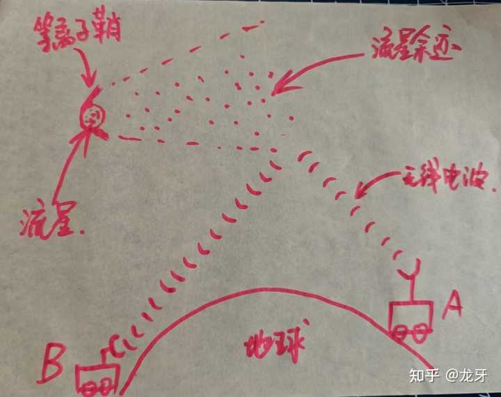 无线电波撞到导体它会反弹,地球上有两个相距遥远的通信车A和B,A发射的电波,到了高层大气撞上流星余迹,反弹以后就可以被B接收到了,反之亦然。这俩通信车之间是互相看不到的,因为地球曲率的存在,直接通信是不可能的,但是有了流星余迹就能间接沟通了。