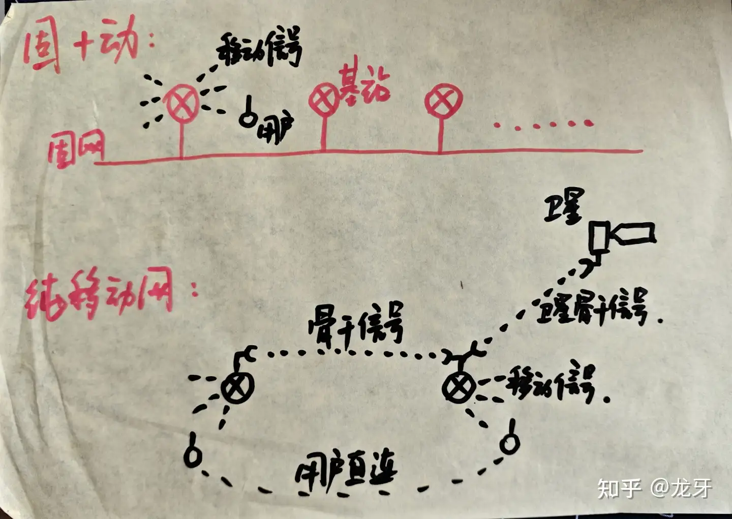 大致手绘一个固+动网络示意图,跟一个纯粹的移动网络对比,就能看出来:纯移动网络是根本不需要固网参与的,一根光纤都不需要也能行。
