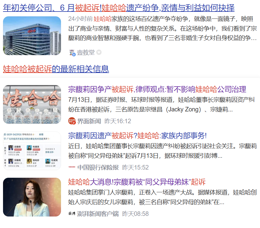 2025年7月,娃哈哈集团原董事长宗庆后的三名私生子宗继昌、宗婕莉和宗继盛,在香港法院起诉娃哈哈集团现董事长宗馥莉,三名原告要求香港法院确认宗庆后于2003年设立的信托资金有效,要求宗馥莉按照宗庆后生前的规划将现有的18亿美元补齐至信托规定的21亿美元。