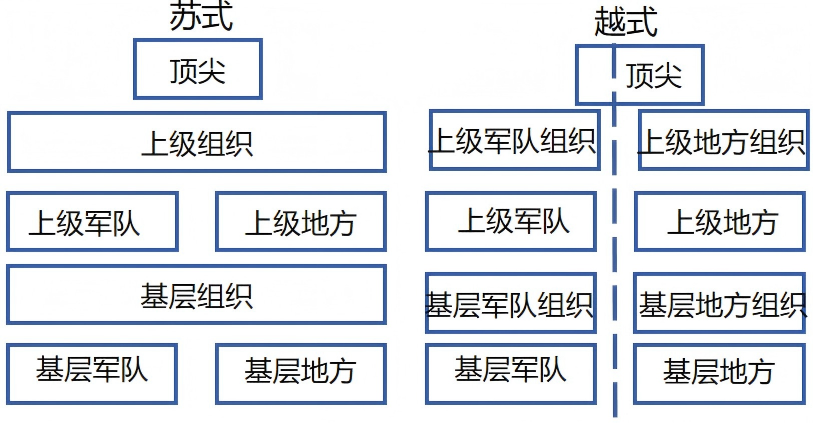 而且,越式和苏式还有一个差别,请看最上一层,苏式制度里整个顶层都能通过组织影响到军队。