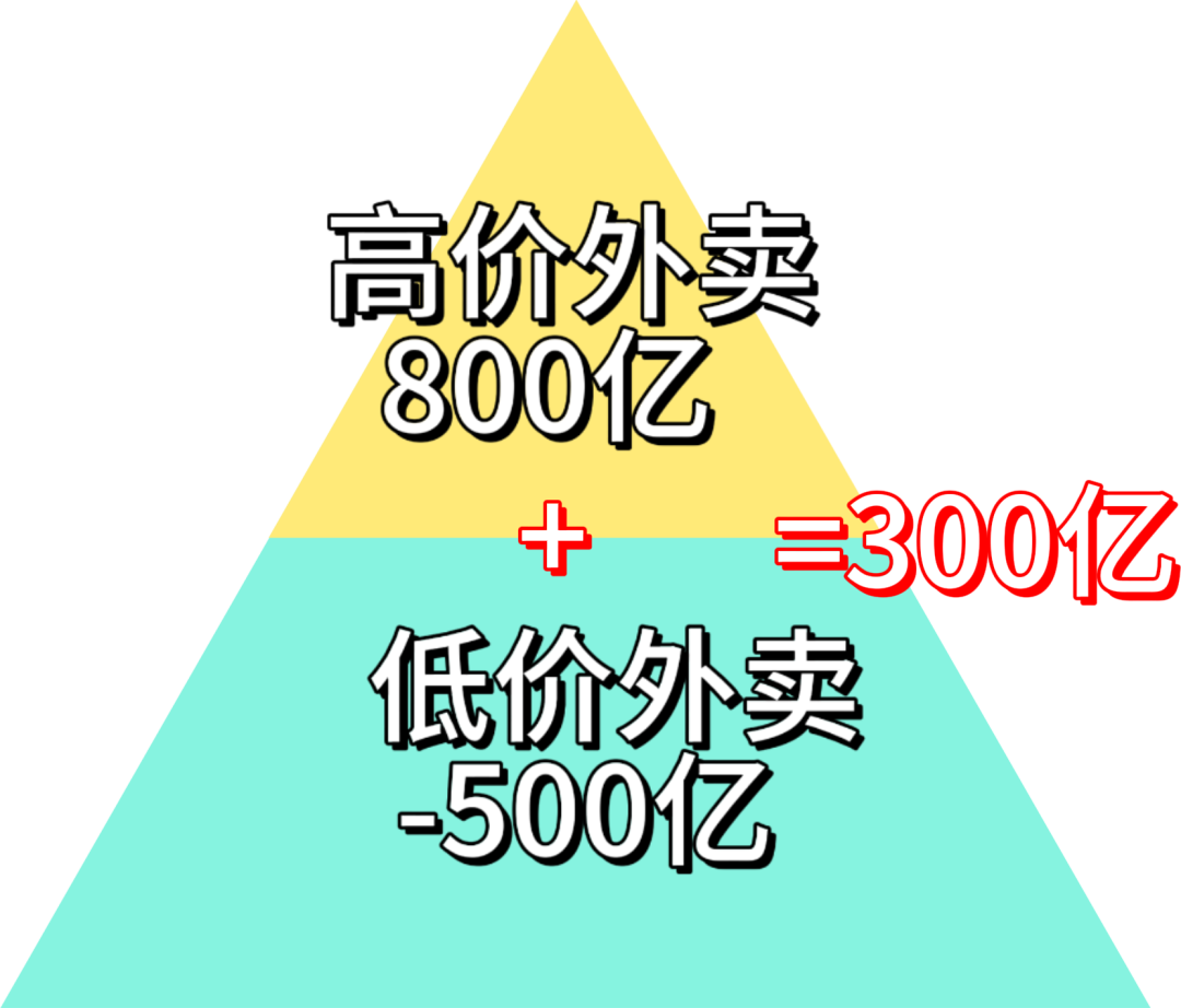 所以如果总的外卖市场利润是300亿的规模,那么会推理出,很有可能高价外卖的利润有800亿,低价外卖的利润是-500亿,两者盈亏一相抵,净剩300亿了。通过这个BUG,你能想到什么战术吗?