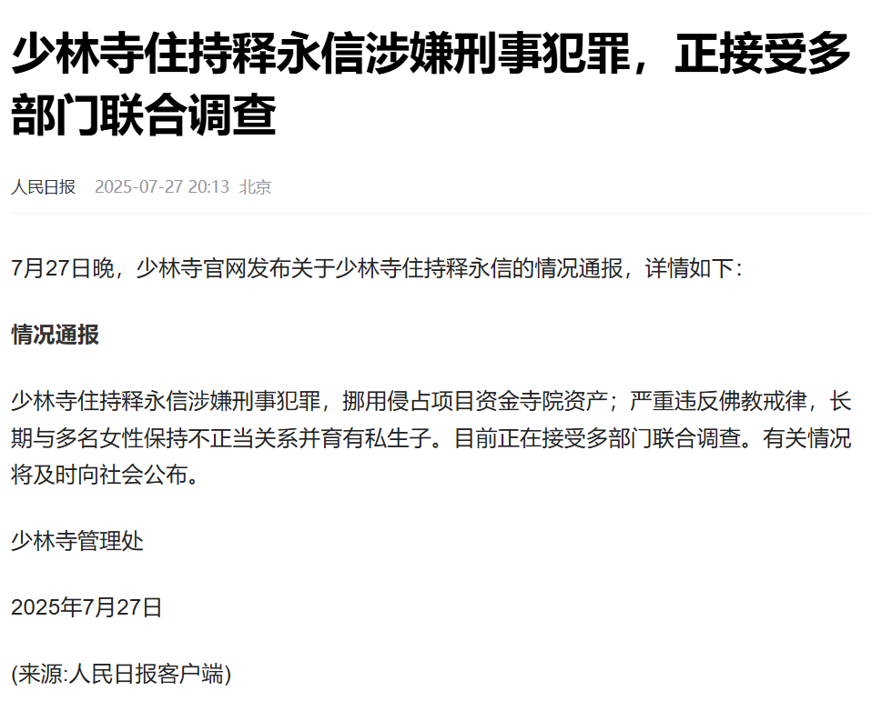 根据官方通告,少林寺方丈释永信挪用侵占寺院资金,长期与多名女性保持不正当关系并育有私生子,涉嫌刑事犯罪,目前正接受多部门联合调查。