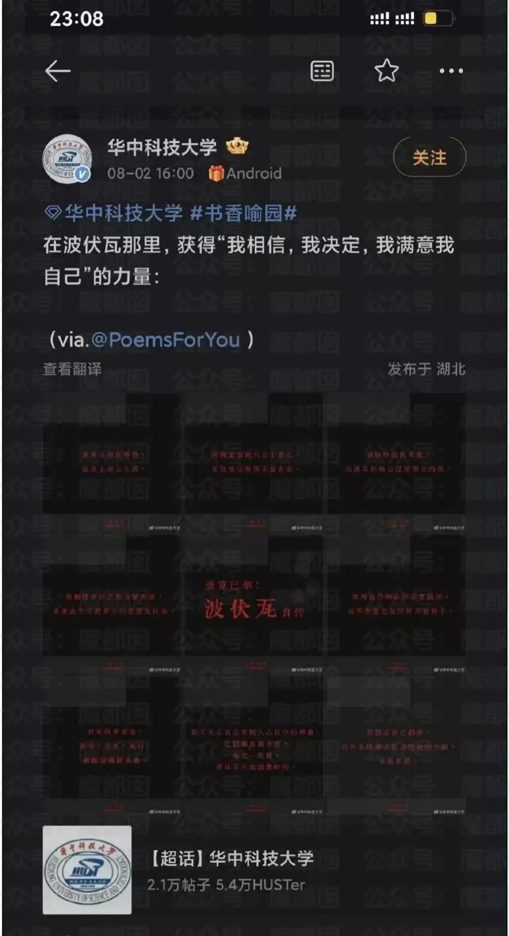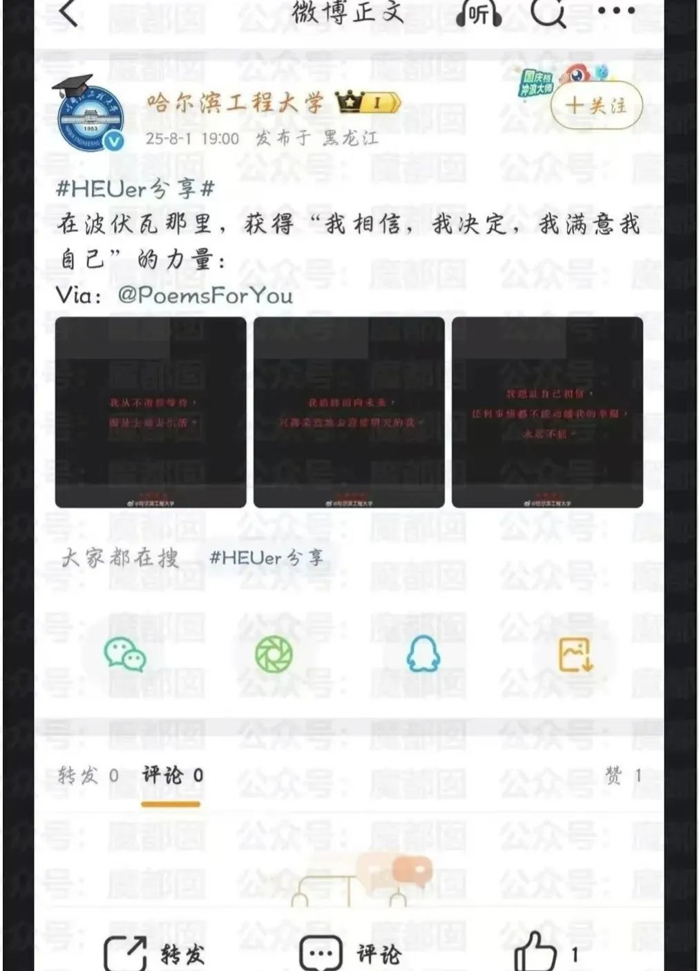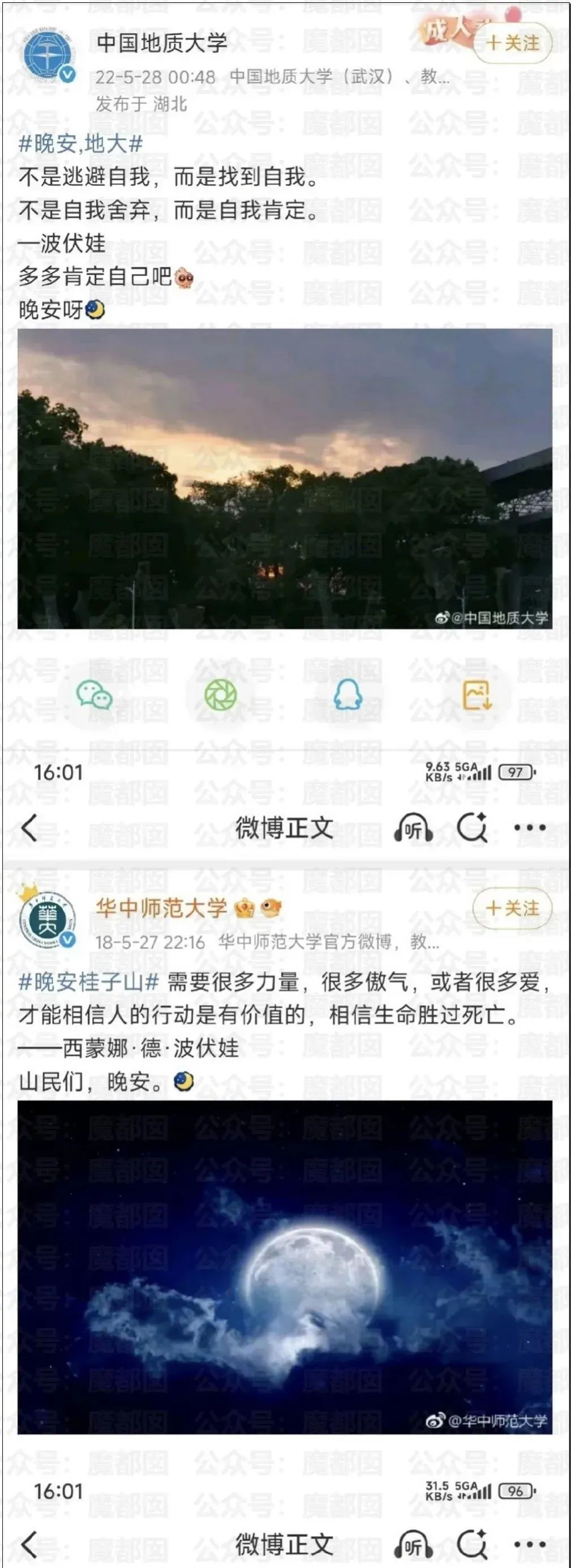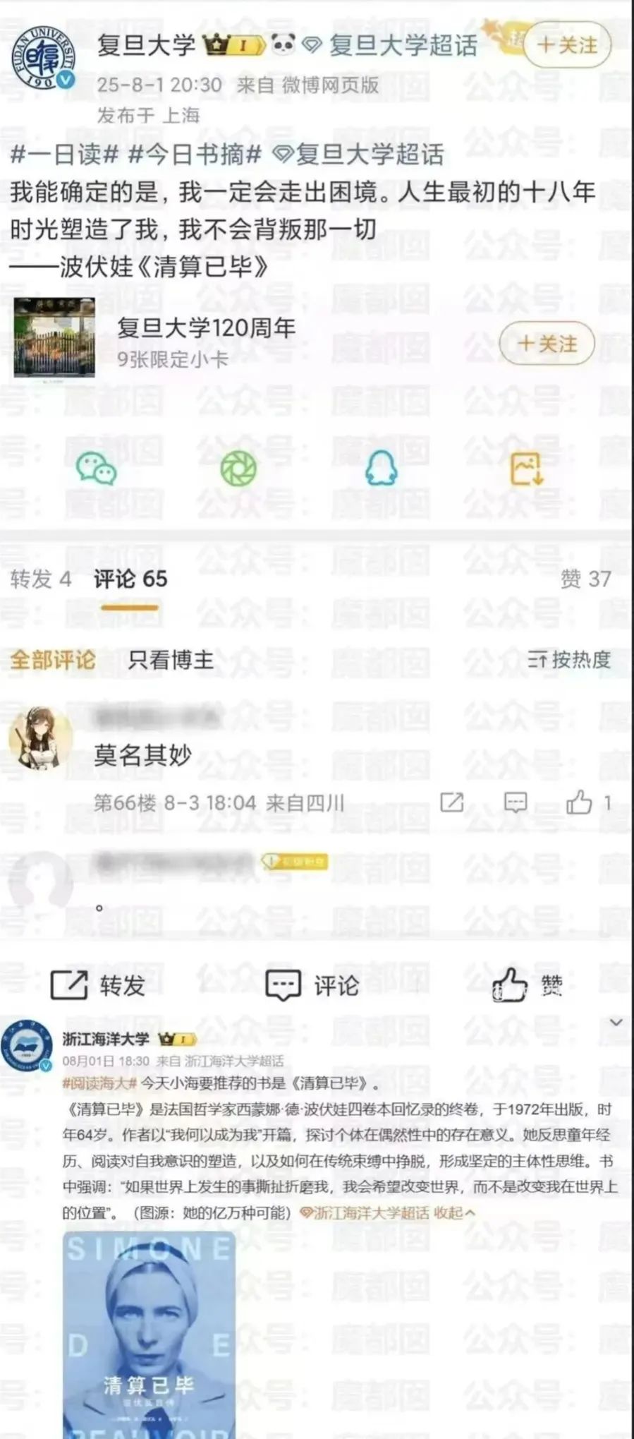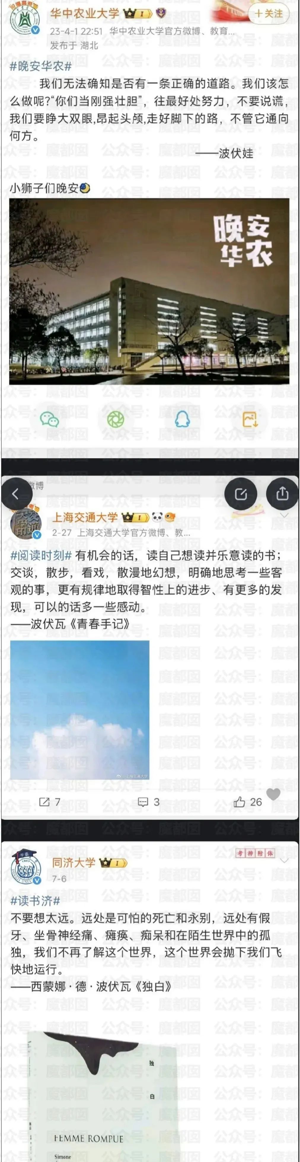 四所高校的官方账号,几乎同时发布上世纪法国作家伏波娃的【觉醒】名言。同时推荐伏波娃的著作《清算已毕》。