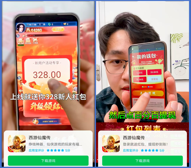 只要是一个正常人就会思考一个问题:“上线就送328,而且还能提现”,如果是真的,那得有多少人去薅羊毛啊?难道游戏开发商是做慈善的?
