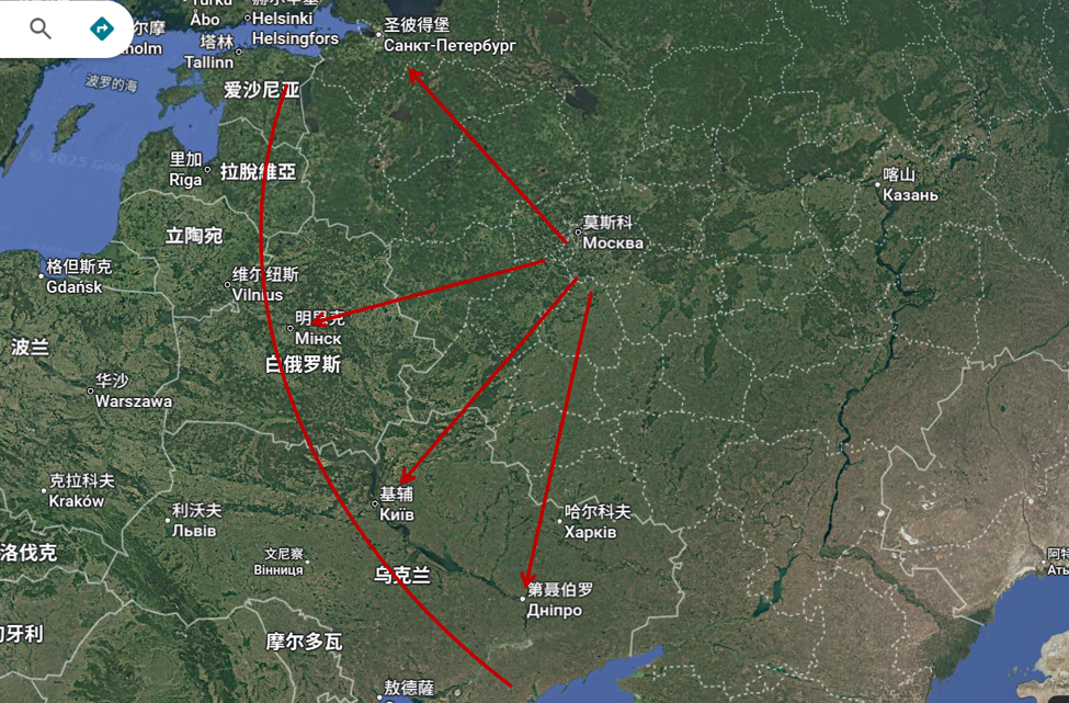 苏联时期,自波罗的海方向沿逆时针看,圣彼得堡(500万人口)、明斯克(200万人口)、基辅(300万人口)、第聂伯罗/哈尔科夫(100万人口)构成了一道放射状弧形,是面向欧洲的前沿城市群,如下图