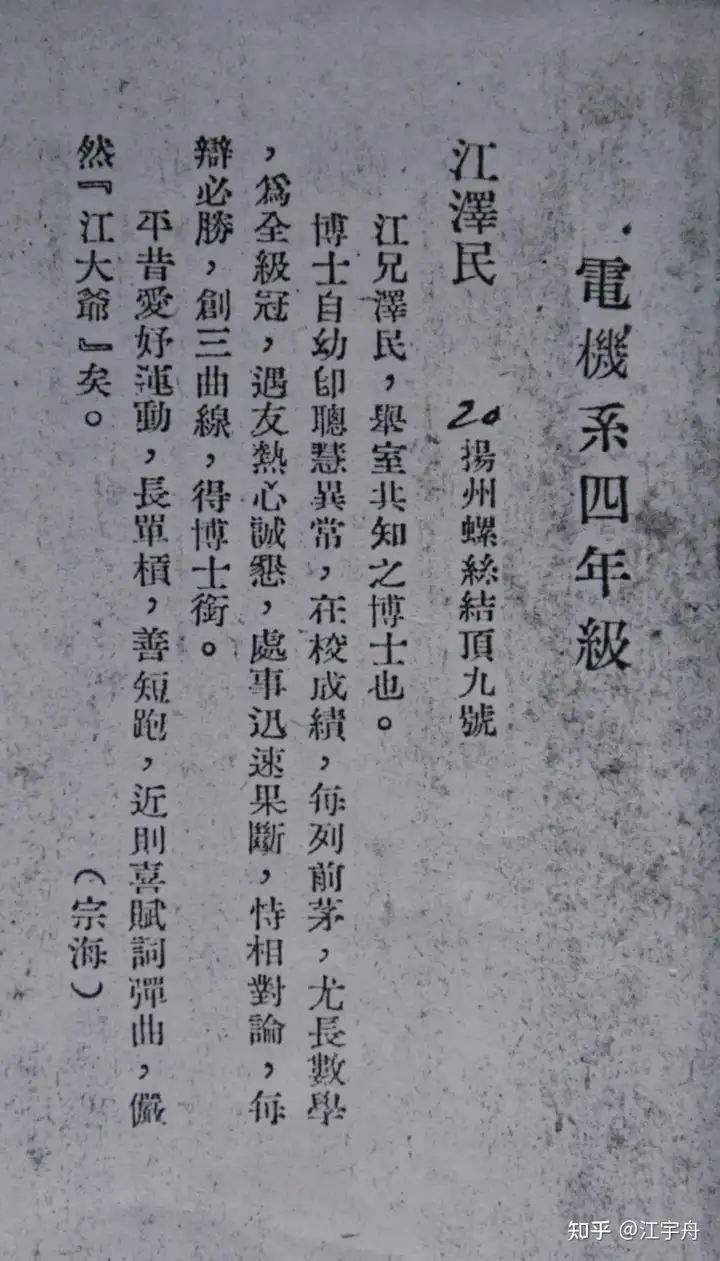 博士自幼即聪慧异常,在校成绩,每列前茅,尤长数学,为全级冠。遇友热心诚恳,处事迅速果断。持相对论,每辩必胜。创三曲线,得博士衔。平昔爱好运动,长单杠,善短跑,近则喜赋词弹曲,俨然“江大爷”矣。