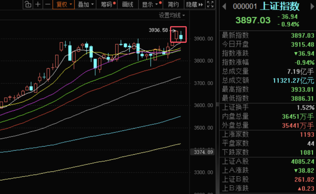10月10日,大盘下跌0.94%,收3897点,重新回到3900下方。