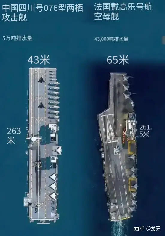 076级实际上比法国的主战航母“戴高乐”号还要大,只不过是全通直甲板两攻。当然那个空警-600是网友P上去做对比的,实际上空警-600估计不会部署到076上,但就算扣掉空警-600,仅以076的态势感知和电磁对抗能力,打小日本还是手拿把掐的。076不如戴高乐的仅仅只有核动力,一来戴高乐那俩潜艇用的小堆连25节航速都跑不出来,二来你小日本离那么近需要核反应堆吗?烧劈柴都能开过去把你揍了。