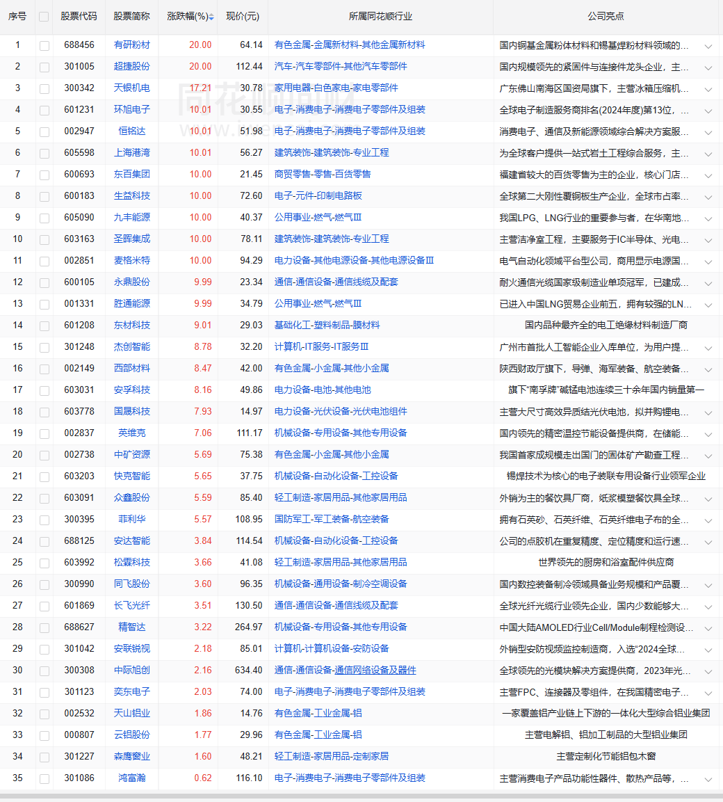 1板:天津普林、恒铭达、麦格米特、宏盛股份、金时科技、中恒电气、英唐智控、环旭电子、江苏华辰、生益科技、永鼎股份、兆驰股份
