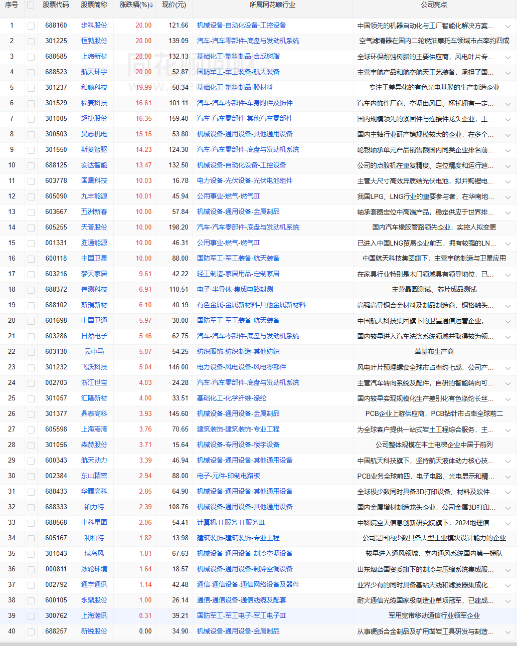 1板:广百股份、中衡设计、电广传媒、金风科技、海格通信、雷科防务、勘设股份、杭萧钢构、魅视科技、博敏电子、航天机电、越秀资本、航天环宇