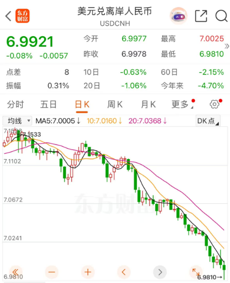 离岸人民币兑美元升破7,创2023年5月以来新高。