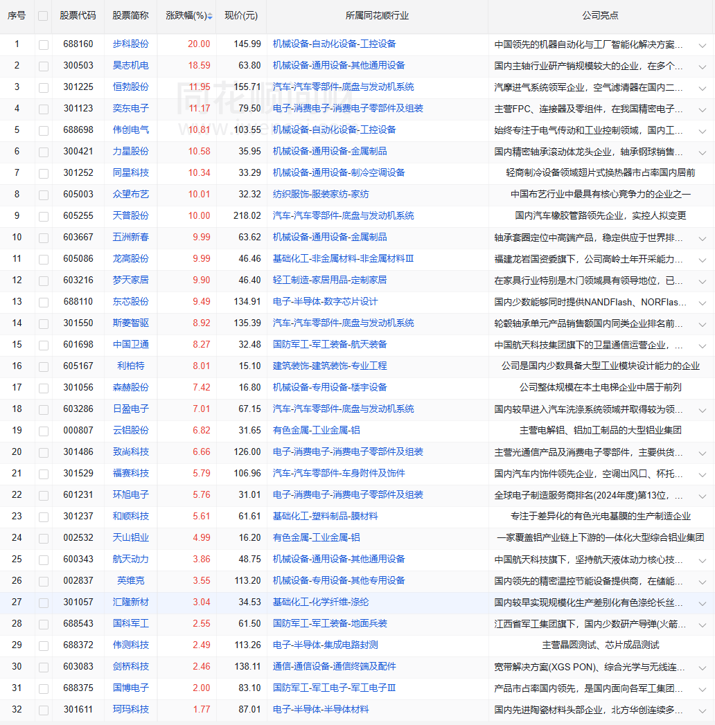 1板:南京新百、新 时 达、天铭科技、晋拓股份、科森科技、万向钱潮、方正电机、三花智控、北特科技、首开股份、海昌新材、福 龙 马、浙江荣泰