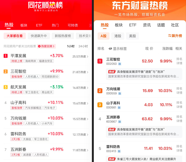 同花顺热榜:平潭发展、三花智控、航天发展、山子高科、万向钱潮