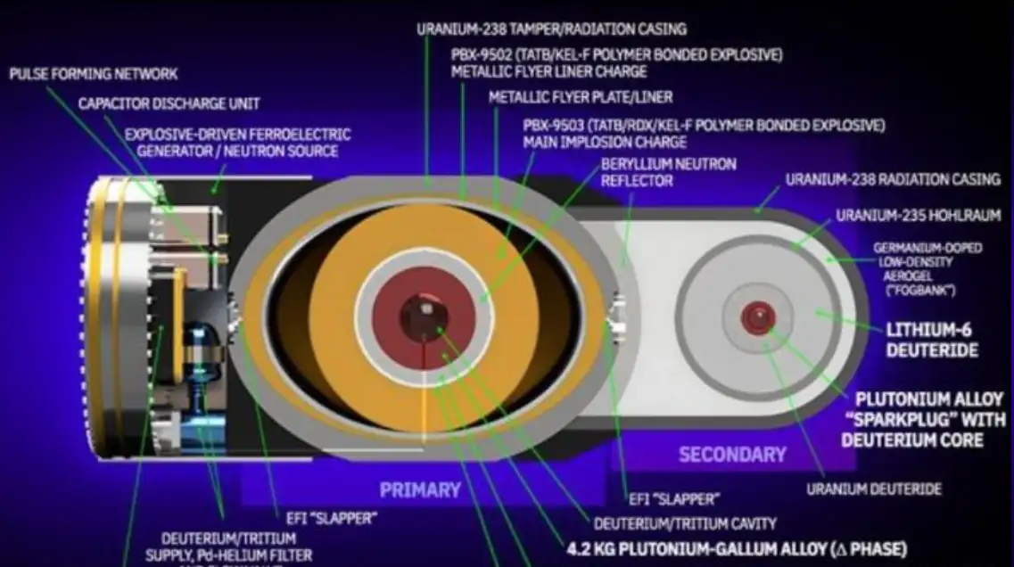 这东西主要分为两个部分,弹体粗的那部分的“初级装置”,简单来说就是一枚原子弹;弹体细的那部分是热核聚变装药,主要是氘化锂-6,一种常见的聚变装药。
