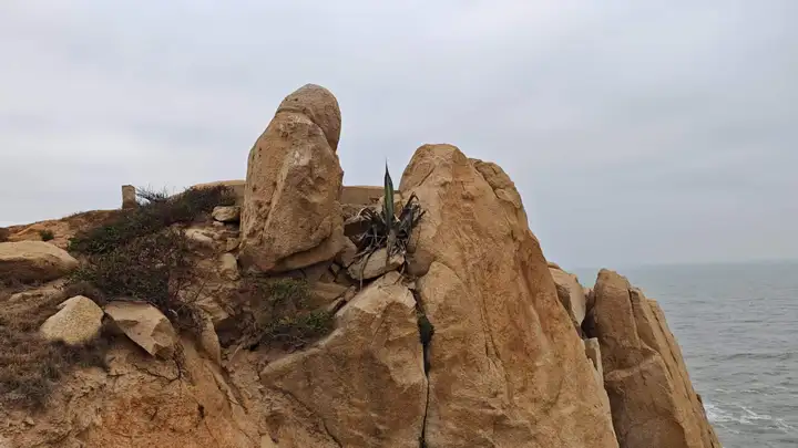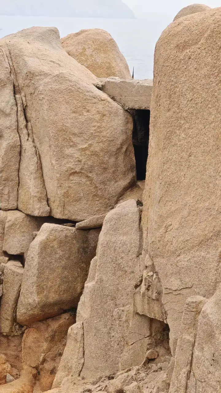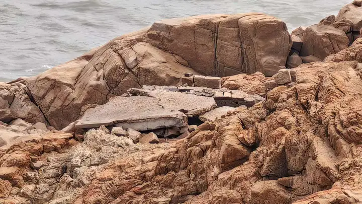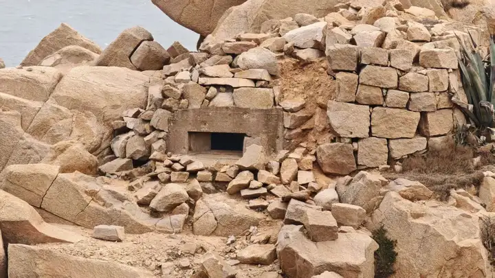 整个阵地残余部分都在北礵岛的所谓“后山”,离村子比较远,需要乘车前往。到达电瓶车的终点站之后走右侧土路会看到一些残破废弃的营房,营房后侧有一条小路,沿着小路走到海岸线可以看到一大堆礁石,绝大多数游客都没有发现这个礁石有什么异常的,甚至我一开始都没有注意这堆破石头有什么不对劲。