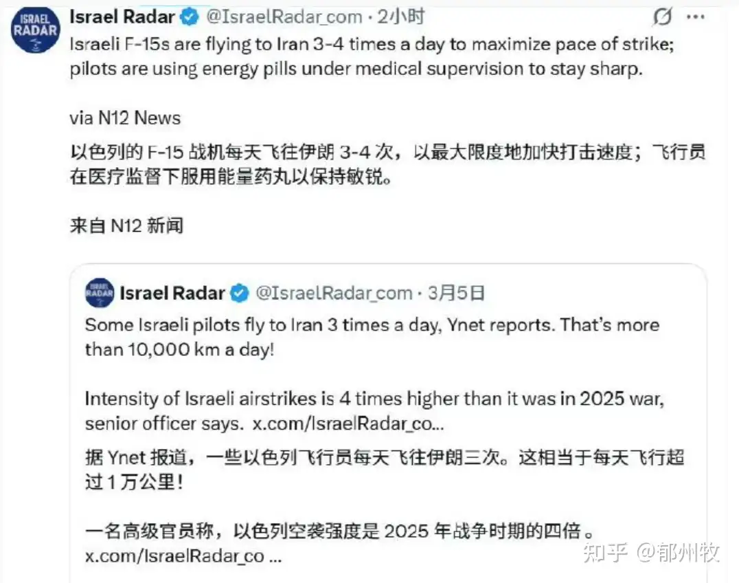 另外,今天以色列内部曝出来,以色列的F15飞行员,每天飞往伊朗来回3-4次,为了能让自己集中注意力,飞行员居然被要求服用强化剂。