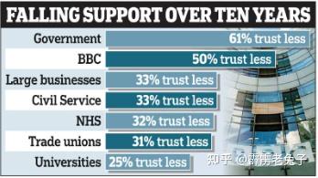 《每日邮报》指出,过去十年间,英国公众对政府的信任度下降了61%,对 BBC 的信任度下降了50%。