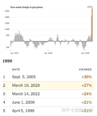 由于与伊朗的战争,美国经历了近三十年来第二大的汽油价格涨幅。