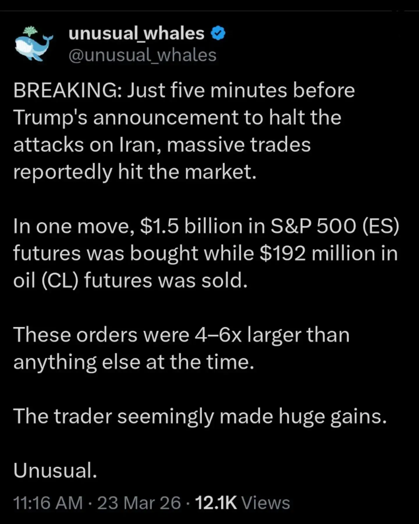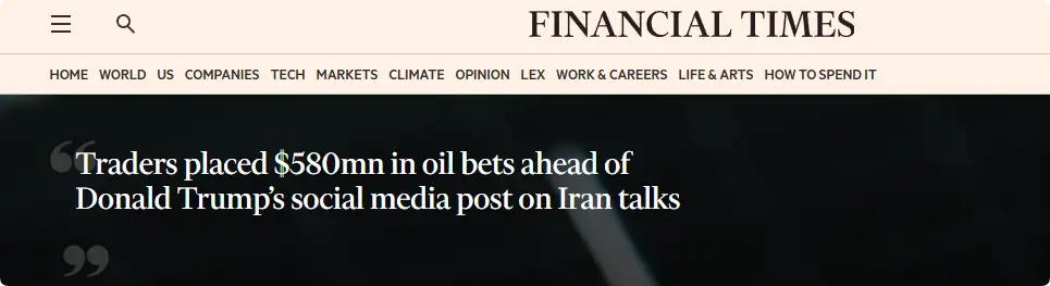 此外,在特朗普宣布停止对伊朗攻击的五分钟前,有人下单了价值15亿美元头寸的标普500指数看涨期货,同时出售了1.92亿美元的石油期货。在该时段发出的此类订单数量达到其他订单的4到6倍。