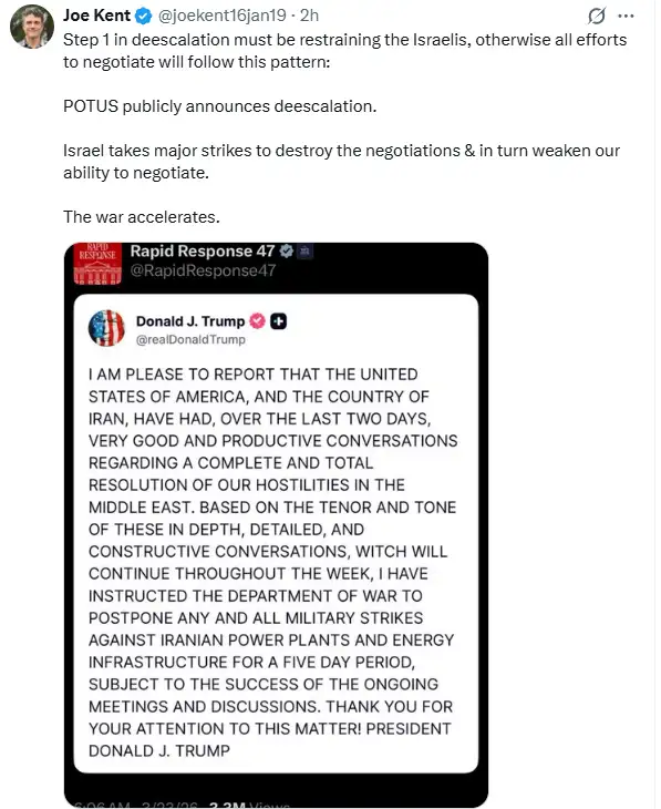 乔·肯特评论了此前特朗普发表的与伊朗谈判的推文:缓和冲突的第一步必须是约束以色列,否则所有谈判努力将遵循以下模式:总统公开宣布降级冲突→ 以色列采取重大打击摧毁谈判,反过来削弱我们的谈判能力→战争加速。