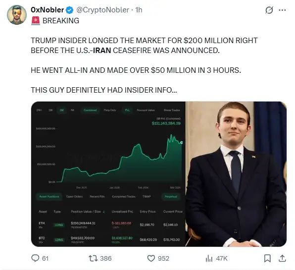 有博主发文称:特朗普内部人士在特朗普发布与伊朗谈判消息前,梭哈2亿美元头寸做多数字货币,三小时赚了5000万美元。