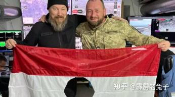 乌克兰驻布达佩斯大使桑多尔与乌克兰武装部队无人机系统指挥官布罗夫迪,拿了一面中间破洞的匈牙利国旗合影。