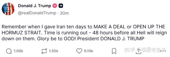 特朗普:“记住,我给了伊朗10天时间达成协议或开放霍尔木兹海峡。时间不多了——只剩48小时了,之后他们将遭受地狱般的惩罚。”