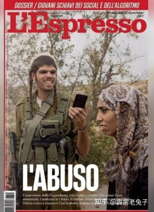 《L’Espresso》杂志的封面标题为“虐待”,内容是一名持枪的以色列定居者在西岸拍摄一名巴勒斯坦妇女。
