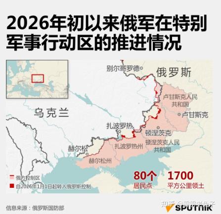 自2026年初以来,已有80个居民点转入俄罗斯控制之下,攻占领土总面积达1700平方公里。