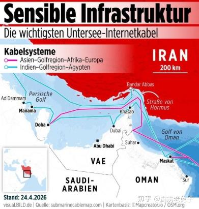 伊朗发布了一张地图,显示至少有七条主要通信电缆沉没在海底,切断将造成严重的经济后果。