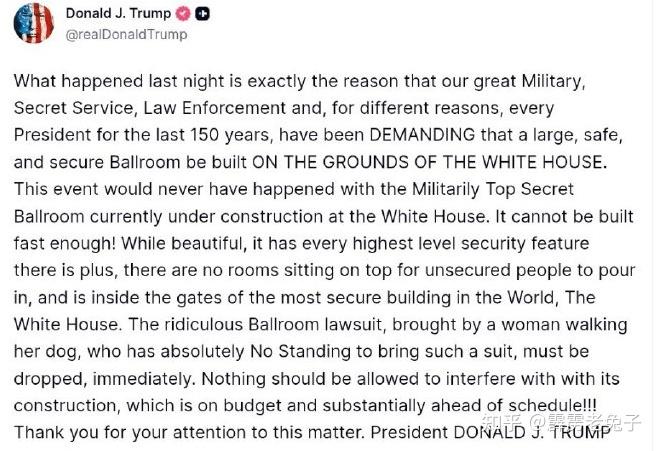 特朗普表示白宫宴会厅应火速建成:昨晚发生的事情,正是我们伟大的军队、特勤局、执法部门,以及出于不同原因的过去150年来的每一位总统,一直强烈要求在白宫院内建造一座宽敞、安全且戒备森严的宴会厅的原因。