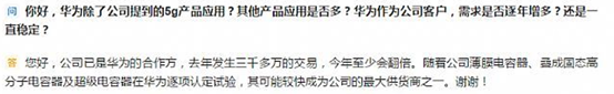 2019年5月31日,国内最大电容器企业之一的江海股份在互动平台上表示,美国封杀华为等公司,将促进民族品牌加大对国内元器件供应商的开发和采购,公司也是受益厂商之一,江海股份表示其是华为的合作方,2018年发生了三千多万人民币的交易,而在2019年至少会翻倍,同时公司薄膜电容器、叠成固态高分子电容器及超级电容器在华为逐项认定试验,其可能较快成为公司的最大供货商之一。