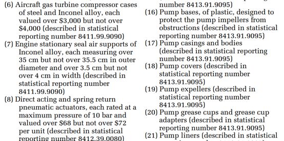 具体涉及哪些商品就不一一列举了,以最近的7月6日这一批为例,豁免的商品就有110项,看下图就知道,涉及到飞机的气体压缩机金属结构件,还有塑料泵底座(用于保护泵叶轮),泵壳和阀体之类。