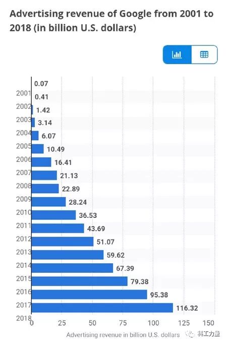 谷歌在2001到2018年之间广告收入 单位:十亿美元