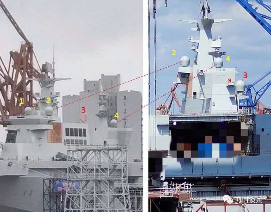 不少人说4个球丑,但4个球自然有4个球的好处,结合下图来看,前面的主桅杆会部分遮挡卫星天线的范围,如果要保证360度不死角,主桅杆前面势必要有一个才行,否则就该装在主桅杆的顶部,但是顶部需要用来装对空警戒搜索雷达,它必须在最高,才能尽可能看到远处低空的来袭目标,这是生死攸关的,而卫星通信不需要多高,只要能保证360度无遮挡就行,4个球刚好完美解决这个问题,看习惯了其实也没有那么丑。