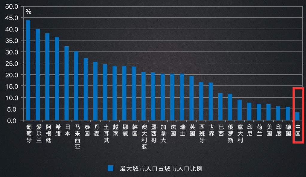 大家看下面这张图,全球主要国家最大城市人口占城市人口比例,我北上广深津渝蓉宁杭汉等大城市是遥遥落后的。